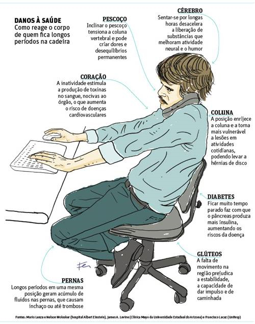 O problema não é ficar sentado, mas sim permanecer em uma mesma posição por horas seguidas, dizem médicos ouvidos pela Folha.