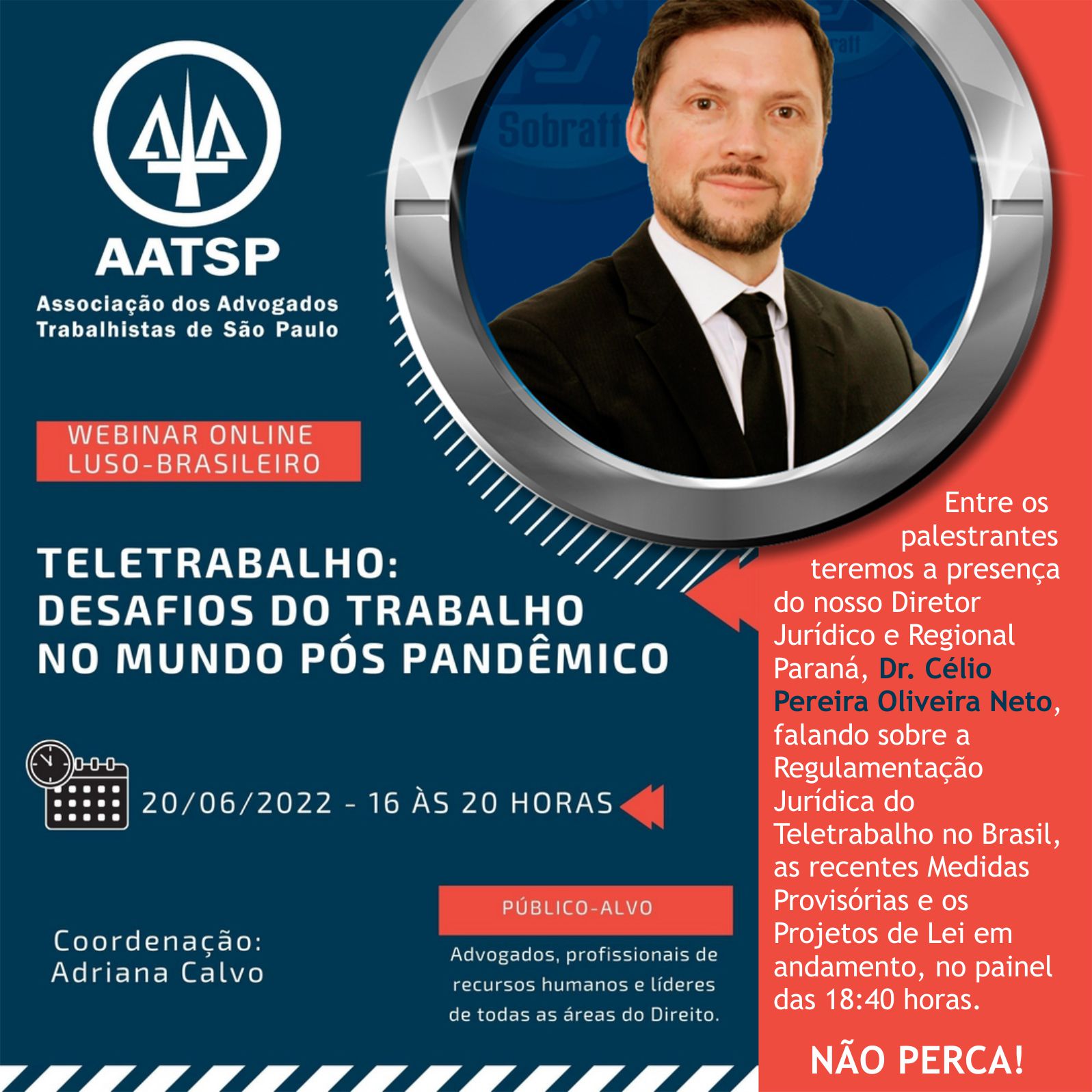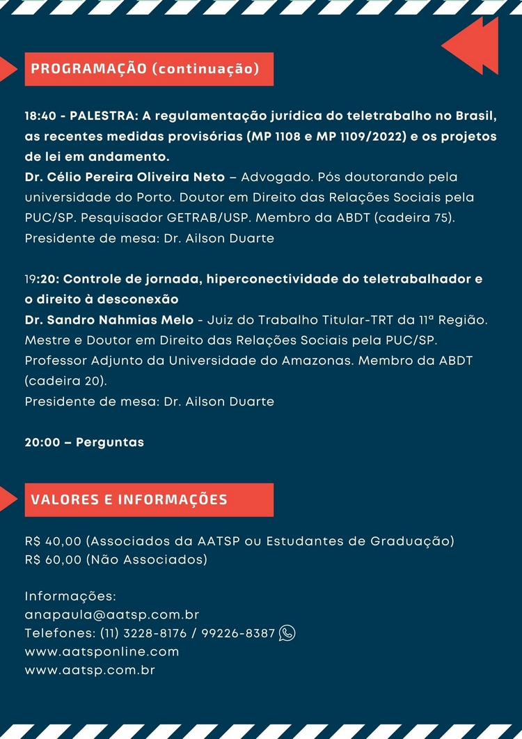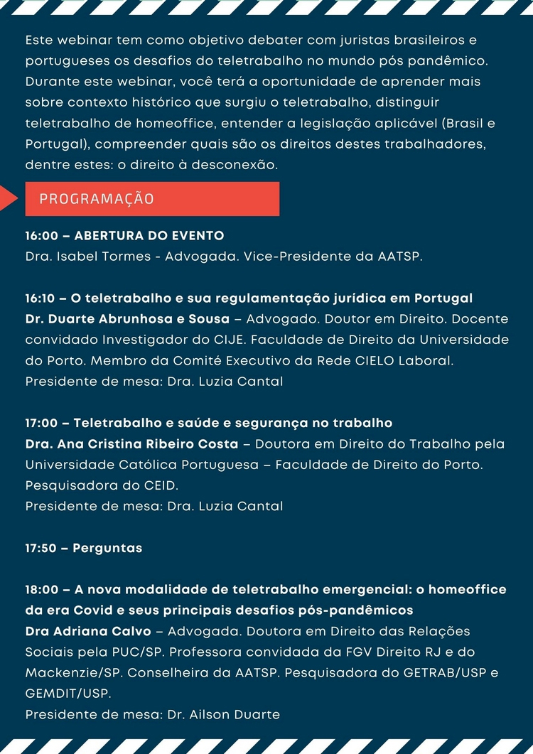 AATSP convida associados, advogados, estudantes e interessados a participar da Webnar Luso-Basileiro: “Teletrabalho: Desafios do Trabalho no Mundo Pós Pandêmico” a ser realizado no dia 20 de junho de 2022, das 16:00 às 20:00 horas.