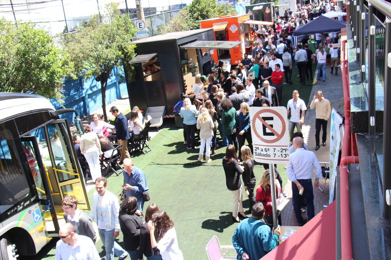 Imagem: rua fechada com food trucks e fluxo grande de pessoas
