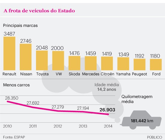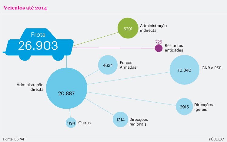 A administração central tinha, em 2014, cerca de 26 mil automóveis, com uma média de 14 anos e 181 mil quilómetros percorridos, segundo dados da Entidade de Serviços Partilhados da Administração Pública. Quatro em cada cinco carros do Estado emitem mais de 130 gramas de CO2 por quilómetro – bastante acima da média dos veículos ligeiros novos vendidos no país, que é de 109 gramas por quilómetro (g/km).